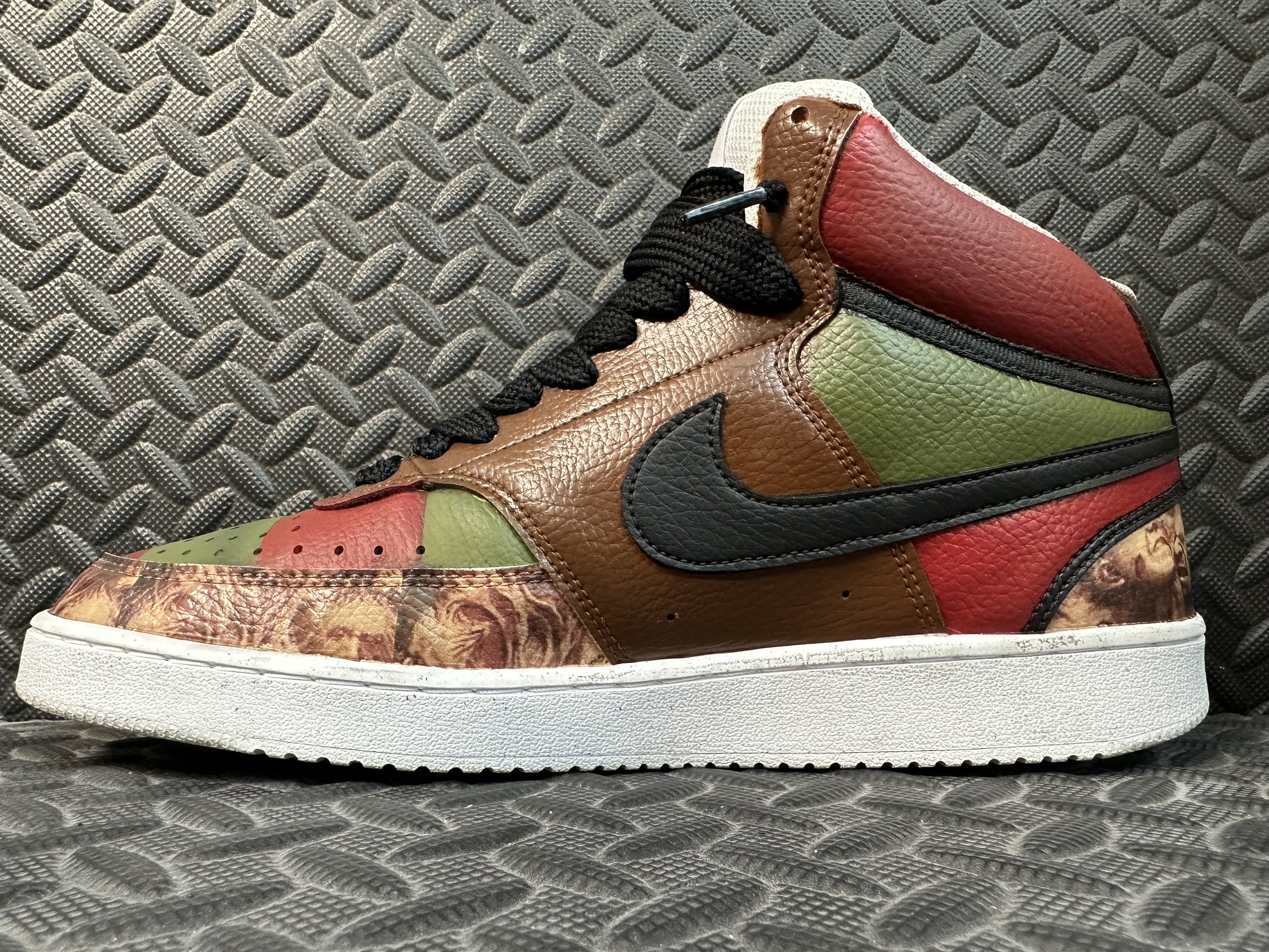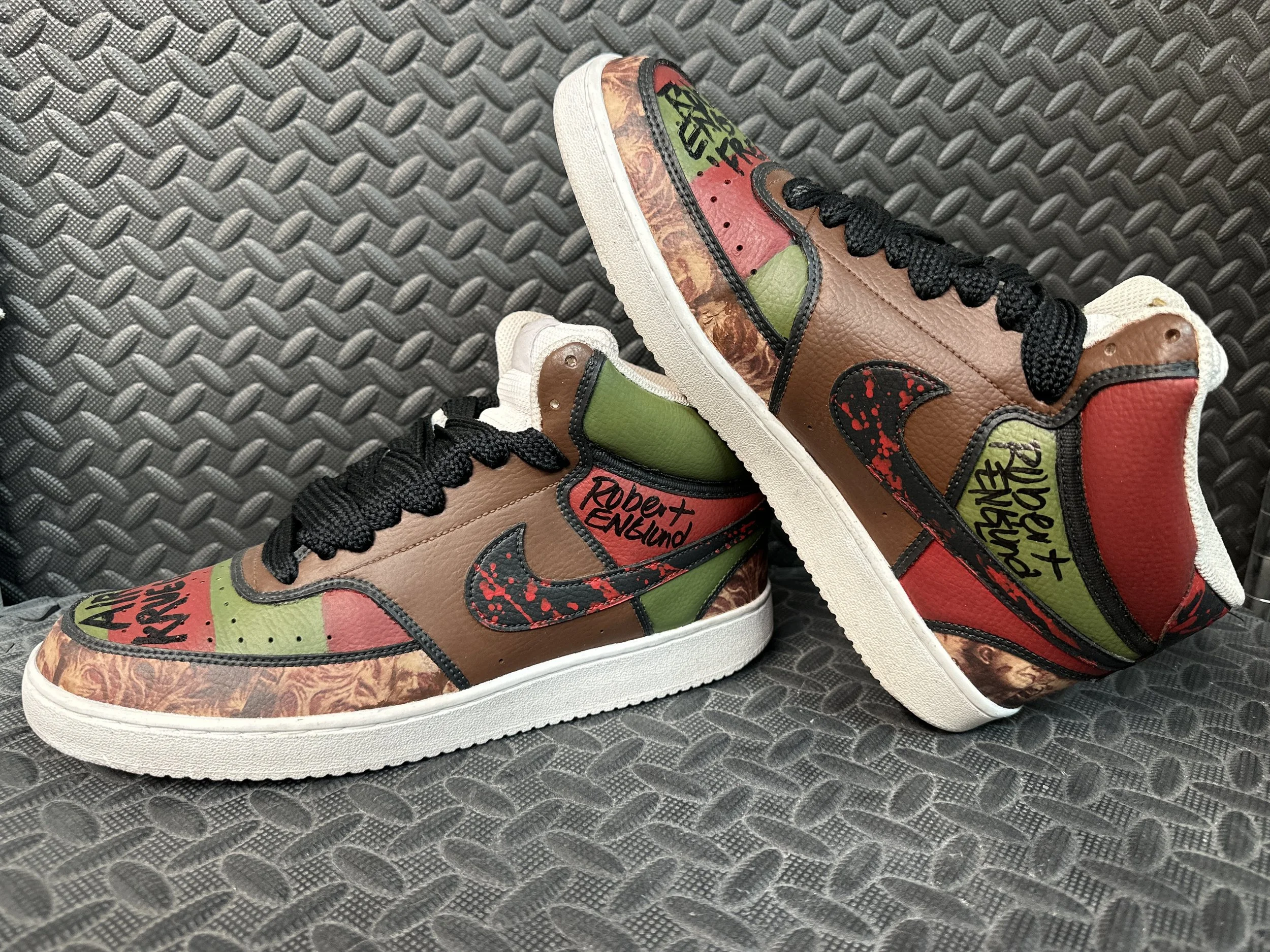 The “Kruegers” started as a plain pair of white Nikes and ended up as a unique tribute to Freddy Krueger, my favorite horror movie character. These shoes are a hybrid between hydrographics and custom paint, combining both techniques to create a detailed, textured look that really stands out. The process was meticulous, layering custom paint with hydro-dipped patterns to capture that iconic Freddy vibe.